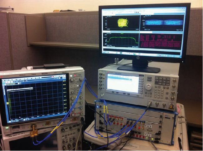 该信号采用 M8190A 任意波形发生器生成,M8190A 运行 IQTools 信号生成软件,并驱动 E8267D PSG 矢量信号发生器上的宽带 I/Q 输入。