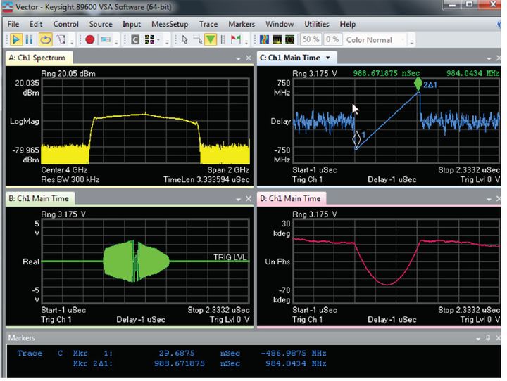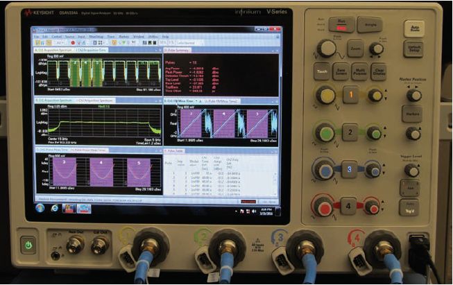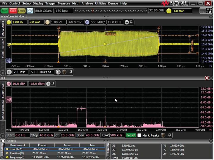 图 2. V 系列 33 GHz 示波器接收采用宽带线性调频调制的 15 GHz 载波脉冲射频信号,并使用在示波器内嵌系统上运行的 89600 VSA 软件进行处理分析。