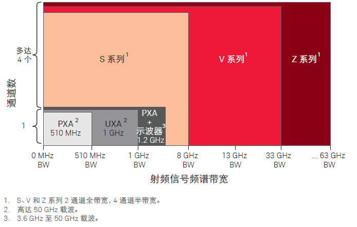 V 系列示波器提供两个 33 GHz 带宽的通道或四个 16.6 GHz 带宽的通道。Z 系列示波器提供两个 63 GHz 带宽的通道或四个 32 GHz 带宽的通道。