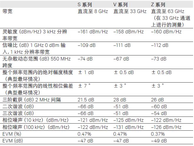 表 1. S 系列、V 系列和 Z 系列典型射频特性比较(请注意附录表 3 至表 5 中各示波器表内所列的测量条件)。