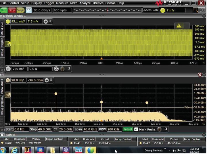 例如,为了捕获具有 20 GHz 载波和 2 GHz 宽调制的信号,需要示波器仍然具有超出 21 GHz 的平坦响应。25 GHz 或 33 GHz 型号的 V 系列 Infiniium 示波器具有高达 80 Gsa/秒的采样速率,能提供所需的性能。我们的经验是,示波器的采样速率应当至少是被测信号中最高频率含量的 2.5 倍。这在本示例中对应大约 50 GHz 的采样率(2.5 * 21 GHz)。