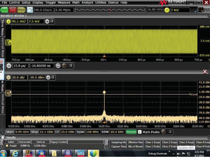 图 7. 频率中心设置为 10 GHz,跨度为 100 MHz,分辨率带宽为 10 kHz,需要一些吞吐量权衡。
