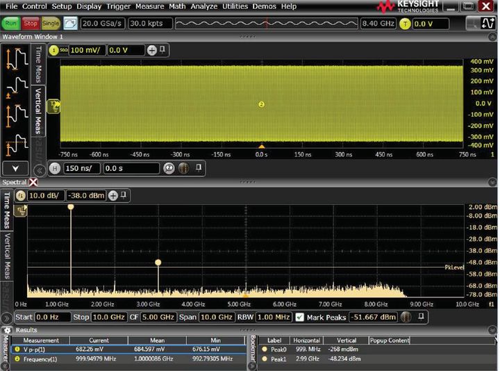 在具有高达 8 GHz 带宽的 S 系列 Infiniium 示波器上可以进行类似的测量。图 8 所示为一个具有 0dBm、1 GHz 干净正弦波输入的捕获和 FFT 示例,其中二次和三次谐波分别在 -65 dBm 和 -48 dBm 处,在 1 MHz 分辨率带宽下忽略二次和三次谐波的无杂散动态范围约为 -68 dBm。