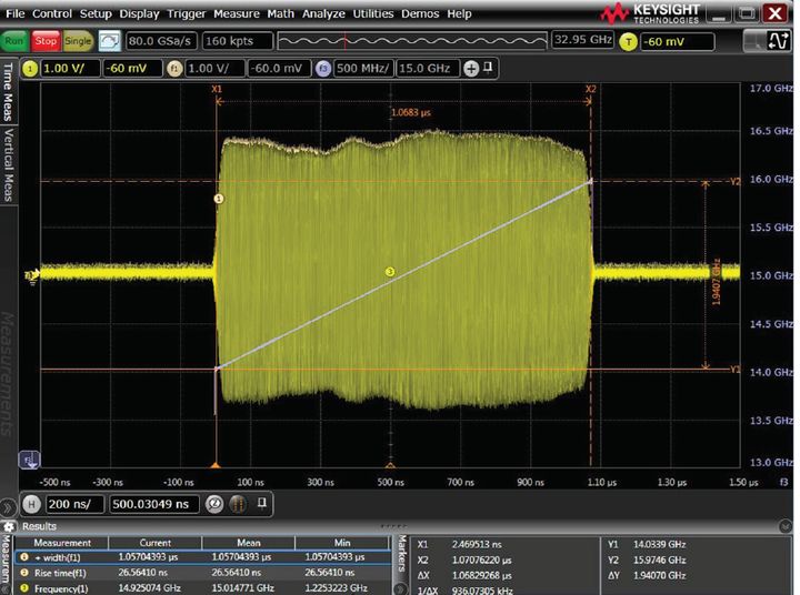 图 9. 使用 V 系列示波器在 15 GHz 载波、2 GHz 宽线性调频射频脉冲上进行的时域测量。