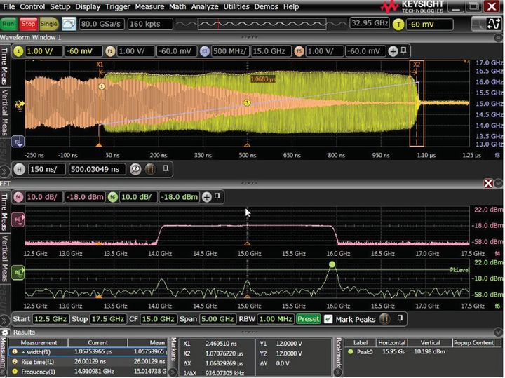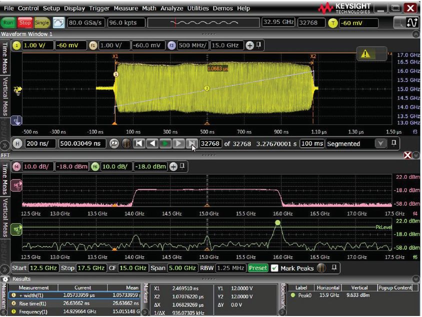 图 10. 使用 V 系列示波器在 15 GHz 载波、2 GHz 宽线性调频射频脉冲上进行宽带 FFT 测量。