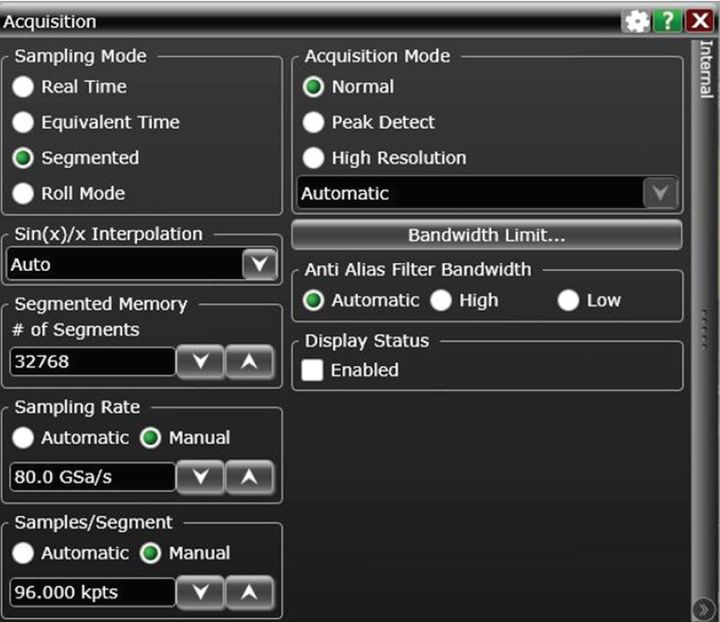 分段存储捕获可以采用 1.2 微秒宽的段进行设置,其中存储深度选择为 96000 点,图 17 所示为 32,768 个段。