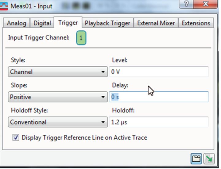 图 19. 将触发源设置为“通道 1”,触发释抑时间设置为 1.2 微秒。