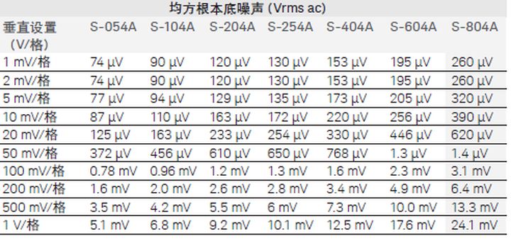 表 2. 不同 V/格设置下的 S 系列示波器均方根噪声电平。