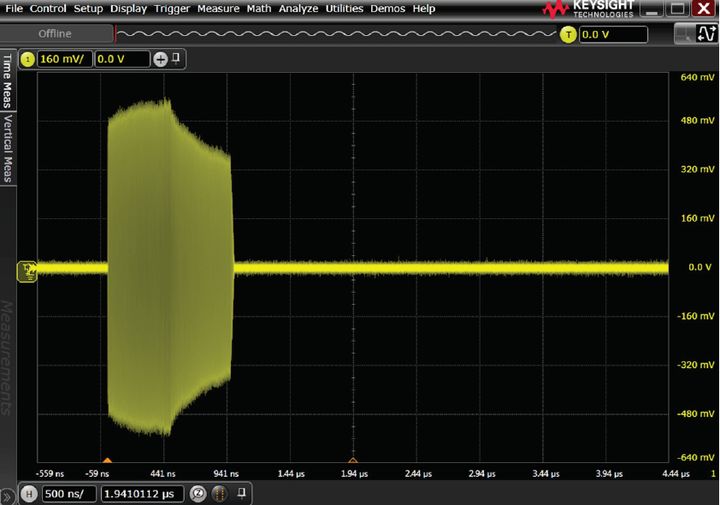 到目前为止,我们已经对脉冲串上的单个射频脉冲进行了测量。通过增加捕获的存储深度,我们可以捕获多个脉冲并对其进行分析。使用完整的 80 Gsa/秒采样率和完整的 2 Gsa 存储深度,对应的捕获时间为 25 毫秒: