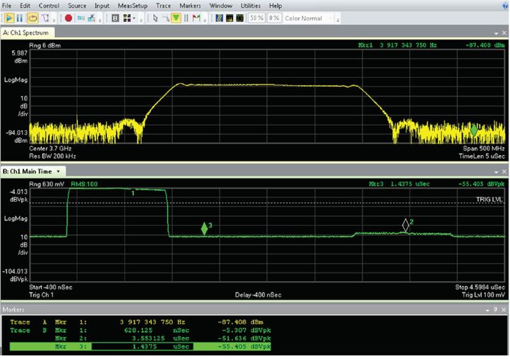 如图 10 所示,出现了一个新的波形窗口,显示捕获的射频脉冲的宽带 FFT。