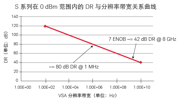 此图不考虑由于各种杂散引起的限制,因此无杂散动态范围(SFDR)仍限制在 50 dB 左右。