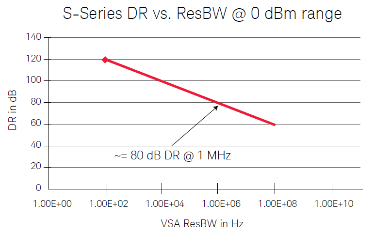 图 24. 矢量信号分析仪软件中 FFT 动态范围与分辨率带宽设置的关系图