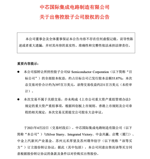 2021年04月22日 | 3.97亿美元,中芯国际计划出售中芯长电全部股权