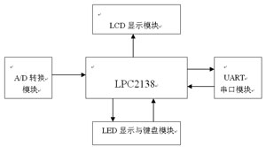 为了实现系统的模块清晰,本系统采用了μC/OS-II操作系统。按照上述要求,本系统将软件划分为4个功能模块:A/D采集模块、LED显示和按键处理模块、LCD显示模块、报警、存储及串口处理模块。采样模块完成对实时数据的采样并保存;LED显示按键处理模块主要功能是对采样数据的处理,并把它们转换成有实际意义的参数;LCD显示模块是将各种参数在LCD显示出来;报警、存储及串口处理模块主要是实时对实时数据进行相应的处理。图1即为总体系统设计整体结构图。