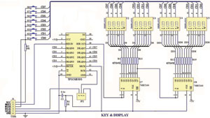 键盘显示部分是利用我们最熟悉的8位LED数码显示加8位键盘输入。图2是自制的LED显示与键盘模块的电路图。利用了飞利浦公司的SPI总线,简单实用,有五根针脚引出。