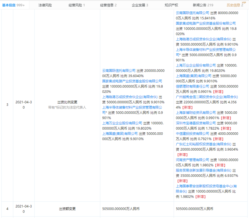 变更后,国家集成电路产业投资基金股份有限公司及上海万业企业股份有限公司,出资比例最高,均为19.8020%。