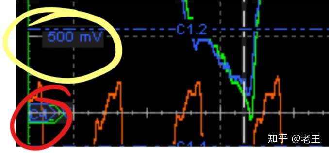 2. 屏幕的左边,有刻度说明,标注了电压值(淡黄色圈),也就是说只要波形到了这个高度,就是对应的电压,但是需要说明的是,由于波形纵向位置可调,因此,该刻度尺的颜色对应了,对应颜色的波形,也就说,只有蓝色波形是可以看改刻度尺的;