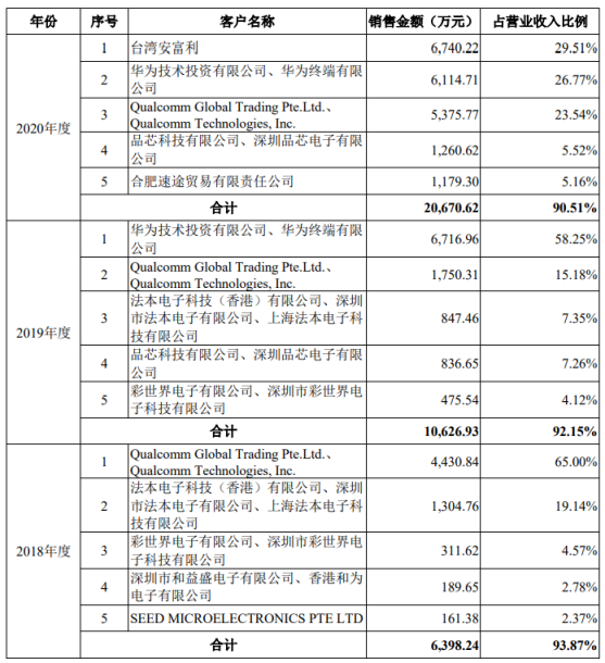 客户方面,其大客户包括元器件分销商安富利、手机厂商华为、平台芯片厂商高通等!值得注意的是,安富利2020年成为其第一大客户,但在2018-2019年,均未出现在其前五大客户名单中!