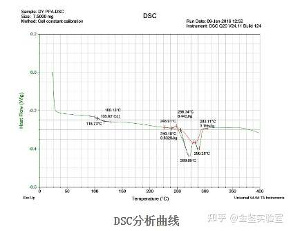 因此,选择一种对热稳定的物质作为参比物,将其与样品一起置于DSC可按设定速率升温的电炉中,分别记录参比物的温度以及样品与参比物间的温度差△T,以温差△T对温度T作图就可以得到一条差热分析曲线,这种热分析曲线称为差热谱图,从差热谱图中可分析出试样的比热容和玻璃化转变温度Tg值。