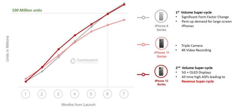 苹果 iPhone 12 系列在 4 月全球销量已破 1 亿台大关,速度比 iPhone 11 快 2 个月。(图片:Counterpoint Research)