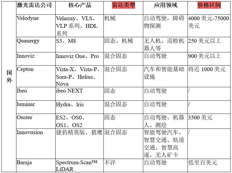 下列是部分国内外知名激光雷达公司的最新产品列举: