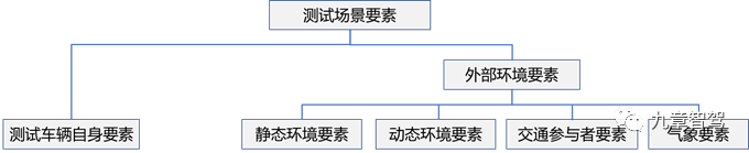 测试场景要素:测试车辆自身要素以及外部环境要素;外部环境要素又包括:静态环境要素、动态环境要素、交通参与者要素、气象要素等。