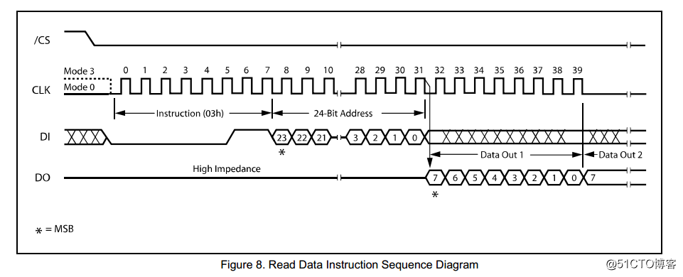 SPI Flash读取数据可以任意地址(地址长度32bit)读任意长度数据(最大 65535 Byte),没有任何限制,数据手册给出的时序如下: