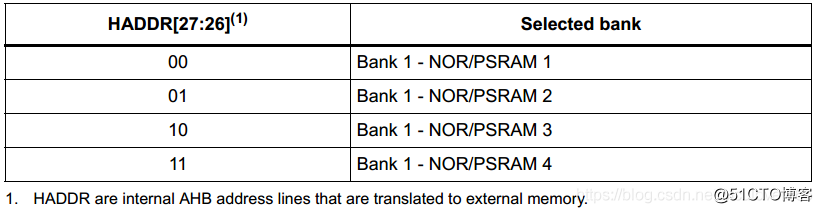 FSMC还有两条内部总线ADDR[27:26],用这两路控制片选信号,如下表: