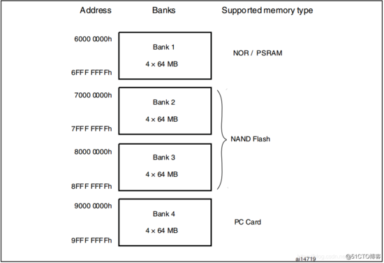 从FSMC的角度来看,外部的存储设备被分为几个固定大小的Bank,每个bank 256 MB。