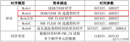 根据SRAM、PSRAM、Nor Flash的综合特点,FMC定义了四种不同的异步时序模型,如下表: