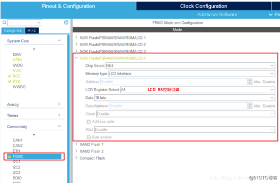 LCD接口类型只会配置用到的那一个地址引脚,而SRAM类型则会配置所有的地址引脚。