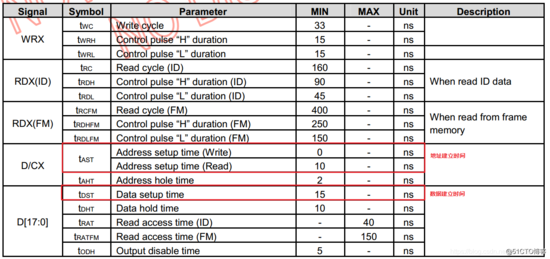 读时序比较慢,该时序的最大值为255个HCLK,从图中可以看出,NT35510控制器要求的数据建立时间最小为15ns,但因为读时序比较慢,所以设为4,4x5.95=23.8ns。