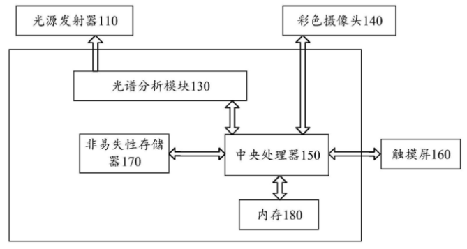 如上图,为该专利中发明的设备解锁方法终端的硬件系统示意图,该系统包括:光源发射器110、光谱分析模块130、彩色摄像头140、中央处理器150、触摸屏160、非易失性存储器170和内存180。中央处理器用于唇动特征分析与解锁行为判断及外设控制;非易失性存储器用于保存程序文件、系统文件和唇动特征信息;内存用于系统与程序运行缓存;触摸屏用于与用户交互。