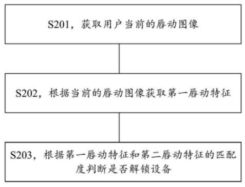 根据唇动特征,还可以获取相应的密码,该密码为用户对着摄像头读出的一段文字或一串数字。最后,根据第一唇动特征与第二唇动特征的匹配度判断是否解锁设备,第二唇动特征就是预先存储的用于解锁设备的唇动特征。例如设置匹配度超过80%时,系统则判断用户认证通过,而如果低于50%,则可以直接禁止解锁设备,以保证设备中数据的安全。