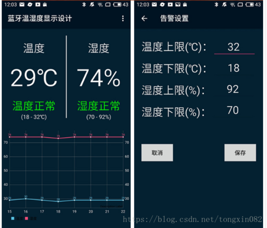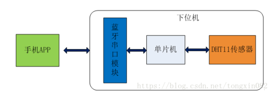 先来看一下整体的架构图:硬件部分由STC89C52单片机、DHT11温湿度传感器、BT08蓝牙串口模块和Android手机组成。传感器将采集到的温湿度数据传送给单片机,然后单片机通过蓝牙串口模块将数据发送到手机APP,从而将温湿度在APP显示出来。在APP上可以设置温湿度告警的阈值,超过阈值将显示“偏高”或者“偏低”的相关信息。