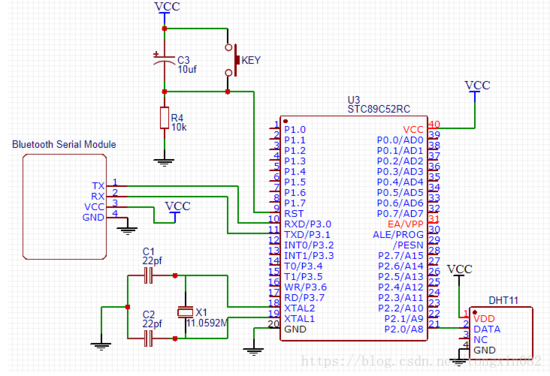 整个设计的原理图如下所示,由单片机最小系统、蓝牙串口模块、温湿度传感器组成。传感器的DATA管脚连接单片机的P2^0口,蓝牙串口模块的RXD、TXD分别连接单片机的TXD、RXD。