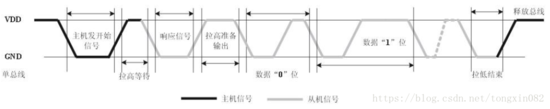用户主机(MCU)发送一次开始信号后,DHT11 从低功耗模式转换到高速模式,待主机开始信号结束后,DHT11 发送响应信号,送出40bit 的数据,并触发一次信采集。信号发送如图所示。这里的主机是指单片机,从机是指DHT11传感器。