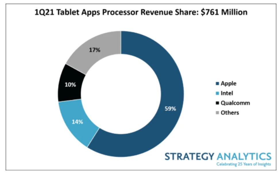 其中,苹果在2021年Q1以59%的收益份额保持了平板电脑应用处理器市场的领先地位,英特尔(14%)和高通(10%)紧随其后。