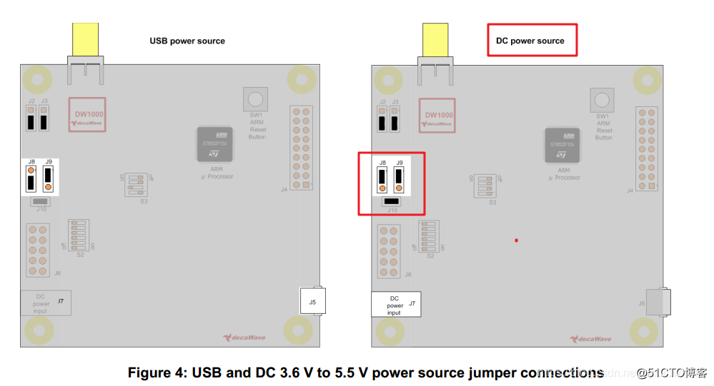 ① 首先将DW1000官方评估板上的S1、S2拨码开关全部拨为OFF,这样配置之后才可以外接控制器。