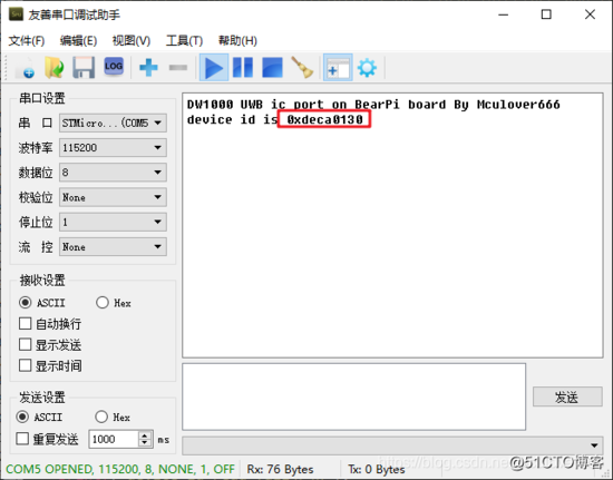 #include /* USER CODE END Includes */ 添加测试函数: /* Private user code ---------------------------------------------------------*/ /* USER CODE BEGIN 0 */ uint32_t dw1000_read_device_id(void) { HAL_StatusTypeDef status; uint8_t header = 0x00; uint32_t device_id; HAL_GPIO_WritePin(GPIOA, GPIO_PIN_4, GPIO_PIN_RESET); status = HAL_SPI_Transmit(&hspi1,&header, 1, 1000); if (status != HAL_OK) { printf("send header fail, err is %drn", status); return 0; } status = HAL_SPI_Receive(&hspi1, (uint8_t *)&device_id, 4, 500); if (status != HAL_OK) { printf("read device id fail, err is %drn", status); return 0; } return device_id; } /* USER CODE END 0 */ 接着在main函数中定义测试变量: /* USER CODE BEGIN 1 */ uint32_t device_id; /* USER CODE END 1 */ 在main函数中调用测试函数: /* USER CODE BEGIN 2 */ printf("DW1000 UWB ic port on BearPi board By Mculover666rn"); device_id = dw1000_read_device_id(); if (device_id != 0) { printf("device id is 0x%8xrn", device_id); } else { printf("device id read failrn"); } /* USER CODE END 2 */ 编译,下载到开发板中,运行,在串口助手查看读取结果,若能正常读取到器件ID(0xDECA0130)则证明可以正常与DW1000通信: