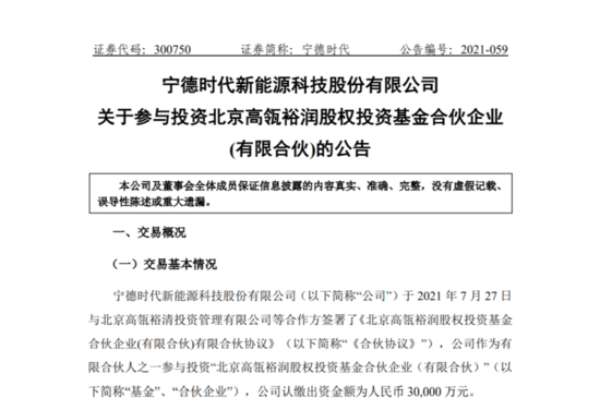 7月27日,宁德时代新能源科技股份有限公司(以下简称:宁德时代)发布公告称,与北京高瓴裕清投资管理有限公司等合作方签署《北京高瓴裕润股权投资基金合伙企业(有限合伙)有限合伙协议》,宁德时代作为有限合伙人之一参与投资“北京高瓴裕润股权投资基金合伙企业(有限合伙)”,认缴出资金额为人民币3亿元。