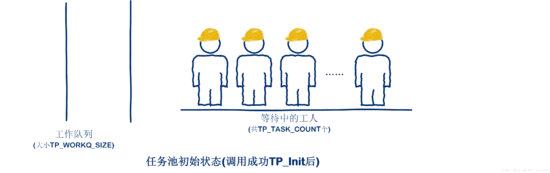 * 在初始化时会创建TP_TASK_COUNT个任务(工人)来等待工作队列并从中依次提出工作来处理,用户则使用