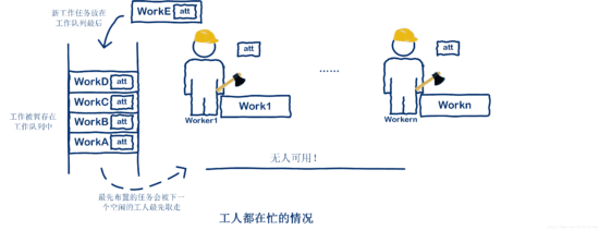 * 所以那些没法立即处理的工作任务会先缓存在工作队列中,等有工人空闲出来后就会继续处理。工作队列的
