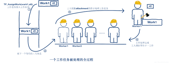 * process, and user call TP_AssignWork to pass work with its attachment to the workqueue.
