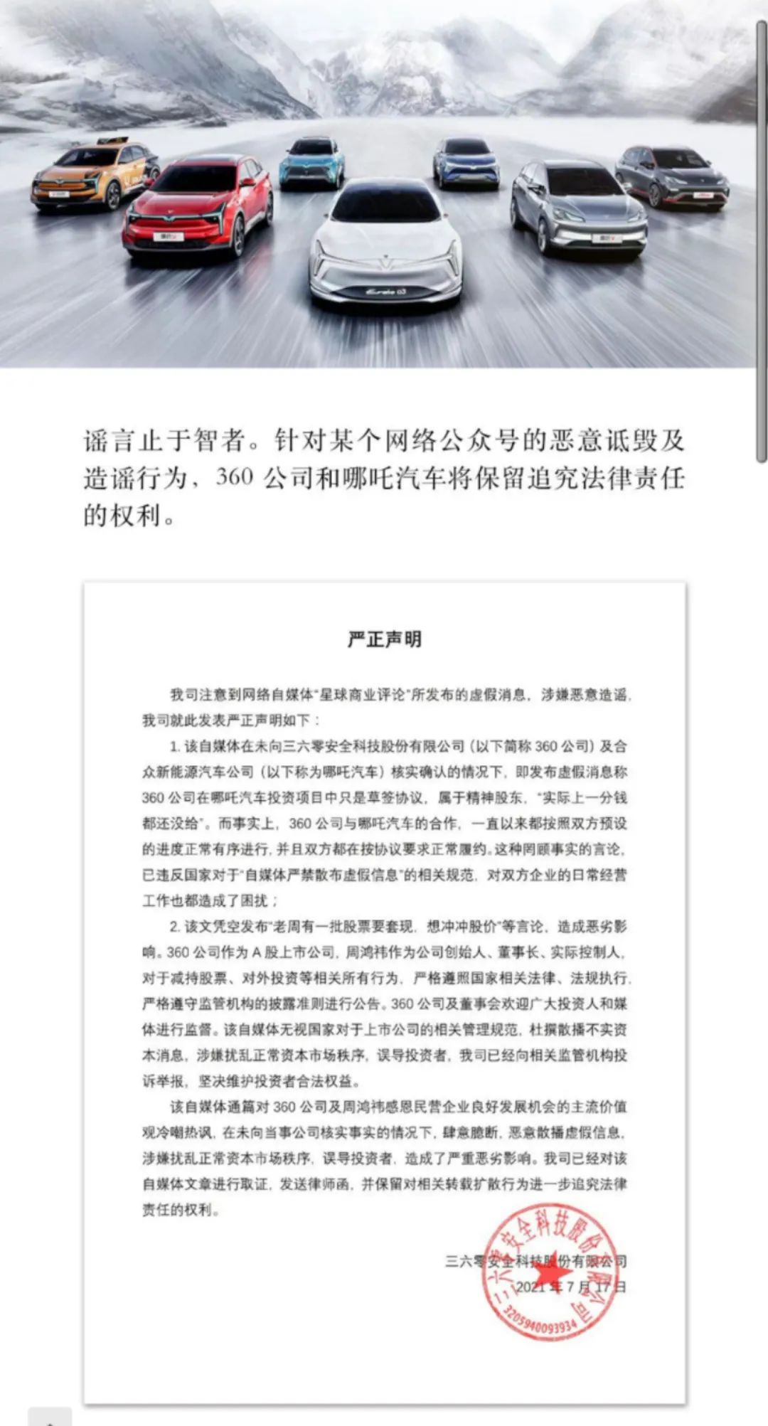 殊不知,就在上周,一篇名为《我害怕的那个人也要造车了》的文章被迅速传播。内容直指周鸿祎本人,并表示其入股哪吒,更多是为了股价运作。当时,仅起草了一份协议,360仅向哪吒汽车调派了部分技术人员,实际上至今一分钱未出,只属于精神股东。
