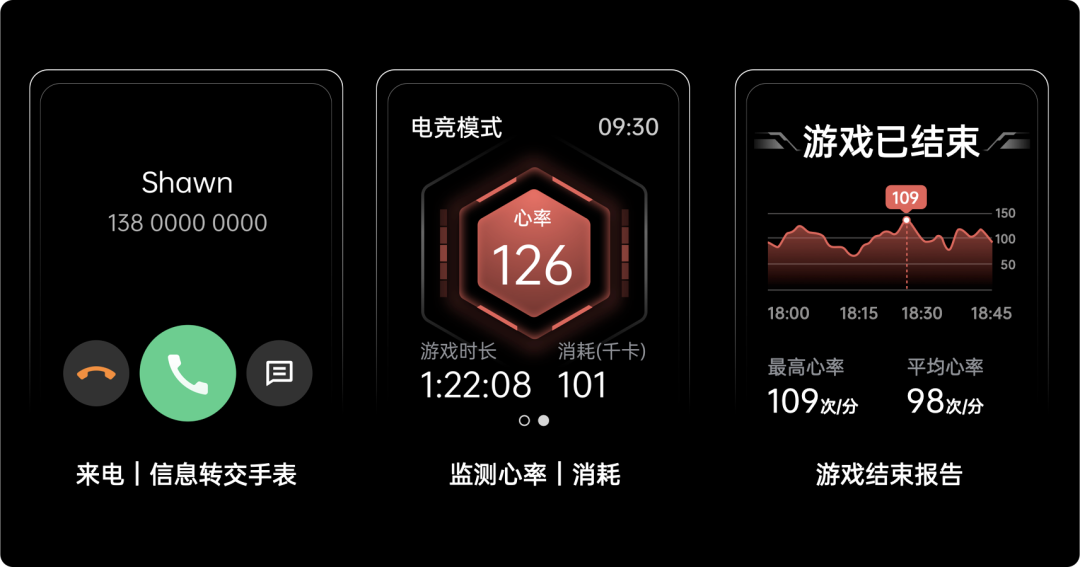 在玩游戏时(目前支持四款当下主流手游),可以在手表上选择进入「电竞模式」。当进入电竞模式后,所有的通知提醒、来电提醒都会转移到手表上、不再在手机上显示,甚至当你的英雄在游戏中“牺牲”时,复活倒计时也可以在手表上实时显示。