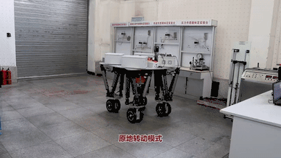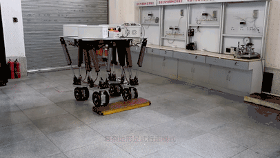 机器人可以实现四轮驱动的轮式运动。最大运动速度可达30km/h,最大爬坡角度为25°。四个轮子可分别相向转动45度,实现顺时针和逆时针原地旋转。机器人通过安装在脚上的触觉传感器,可实现不平地面的漫步行走。