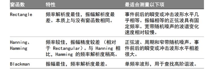 有四个 FFT 窗函数。每个窗函数都会在频率解析度和幅度精度之间进行折 衷。您要测量的内容以及源波形特征有助于确定要使用的窗函数。使用表 6 中的指导选择最佳窗函数。