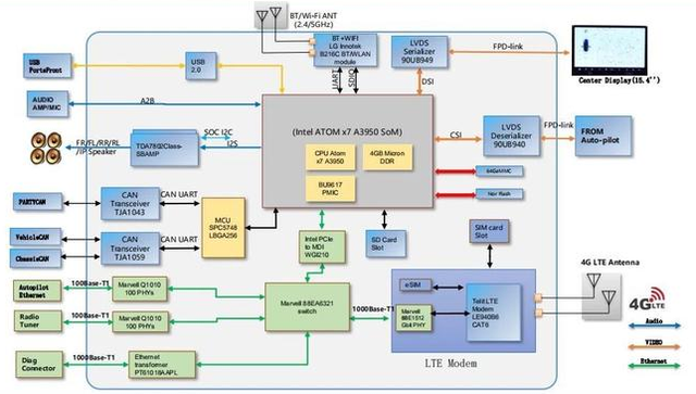 在天际汽车的一份材料中,对这个MCU2的框图做了一个比较完整的描绘,供各位参考。
