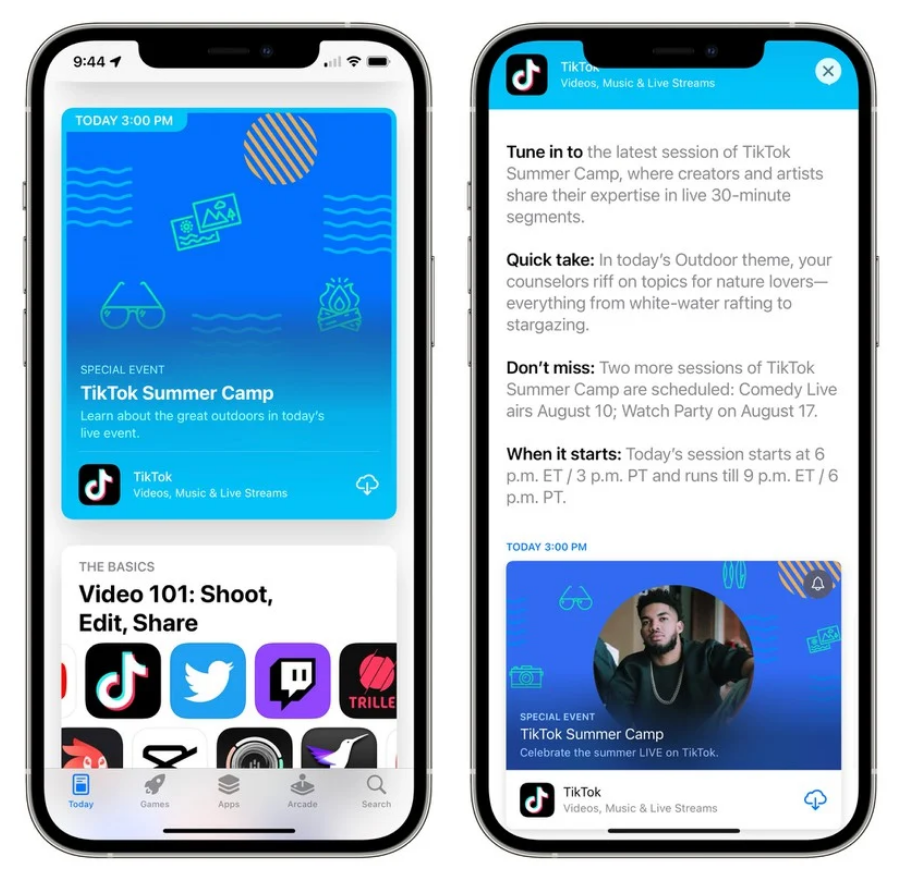 作为今日视图中的一张卡片,第一个 App Store 活动事件有一个标签,写着发生的时间和下载 TikTok 的链接,TikTok 是正在进行活动的应用程序。点击它可以提供更多关于该活动的信息,在这种情况下,它是夏令营会议,创作者和艺术家可以与粉丝分享他们的专业知识。